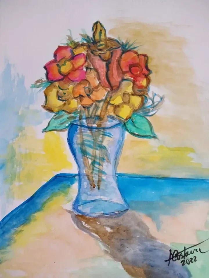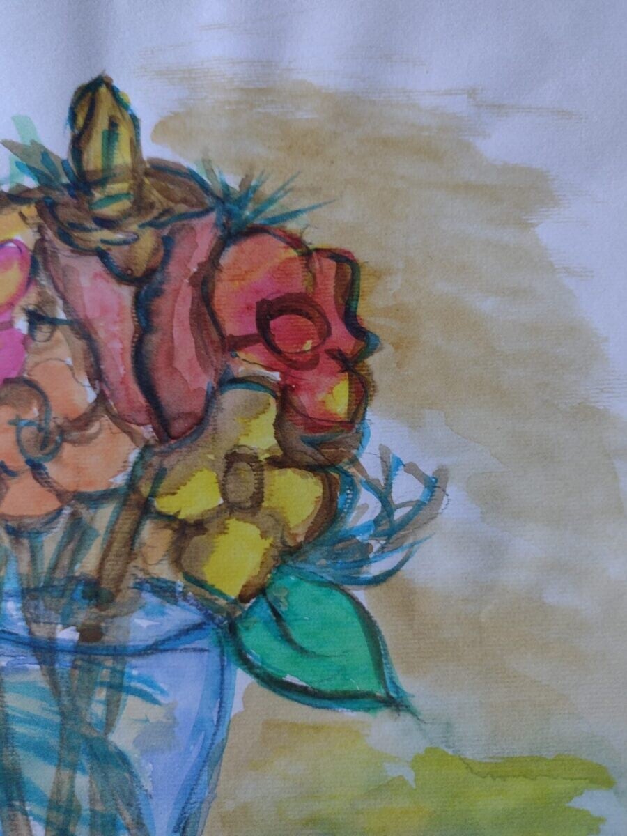 Dipinto ad acquerello. Fiori in vaso trasparente – opera con autentica